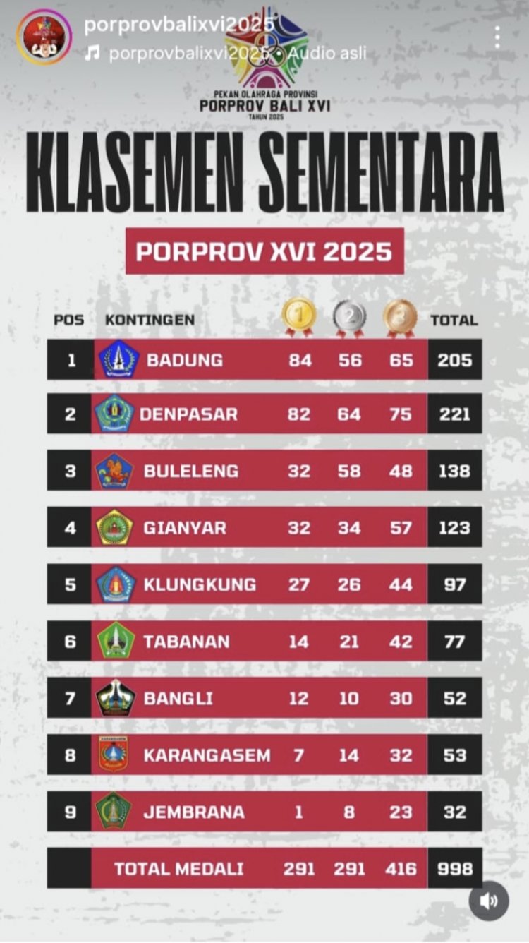 DENPASAR – Persaingan menuju gelar juara umum Pekan Olahraga Provinsi (Porprov) Bali XVI 2025 semakin memanas. Hingga Kamis (11/9/2025) malam pukul 19.01 WITA, kontingen Badung yang berstatus juara bertahan hanya unggul tipis dua emas atas Denpasar.