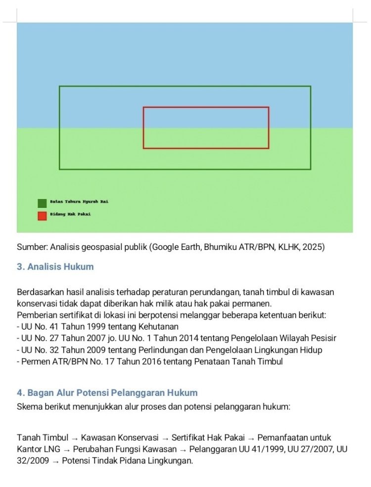 Kajian hukum menunjukkan, kegiatan di Tahura Ngurah Rai tersebut berpotensi melanggar enam regulasi penting, termasuk UU Kehutanan, UU Lingkungan Hidup, dan Perda RTRW Bali Nomor 16 Tahun 2009. Dugaan pelanggaran makin tebal setelah ditemukan adanya sertifikat Hak Pakai atas tanah timbul di kawasan Muntig Siokan, Sidakarya, yang masuk dalam batas kawasan konservasi.