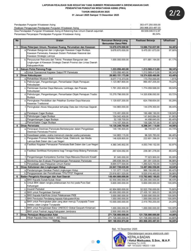 Denpasar, Bali — Realisasi dana Pungutan Wisatawan Asing (PWA) Tahun Anggaran 2025 menunjukkan capaian yang relatif tinggi, namun menyisakan pertanyaan serius terkait efektivitas penggunaannya.